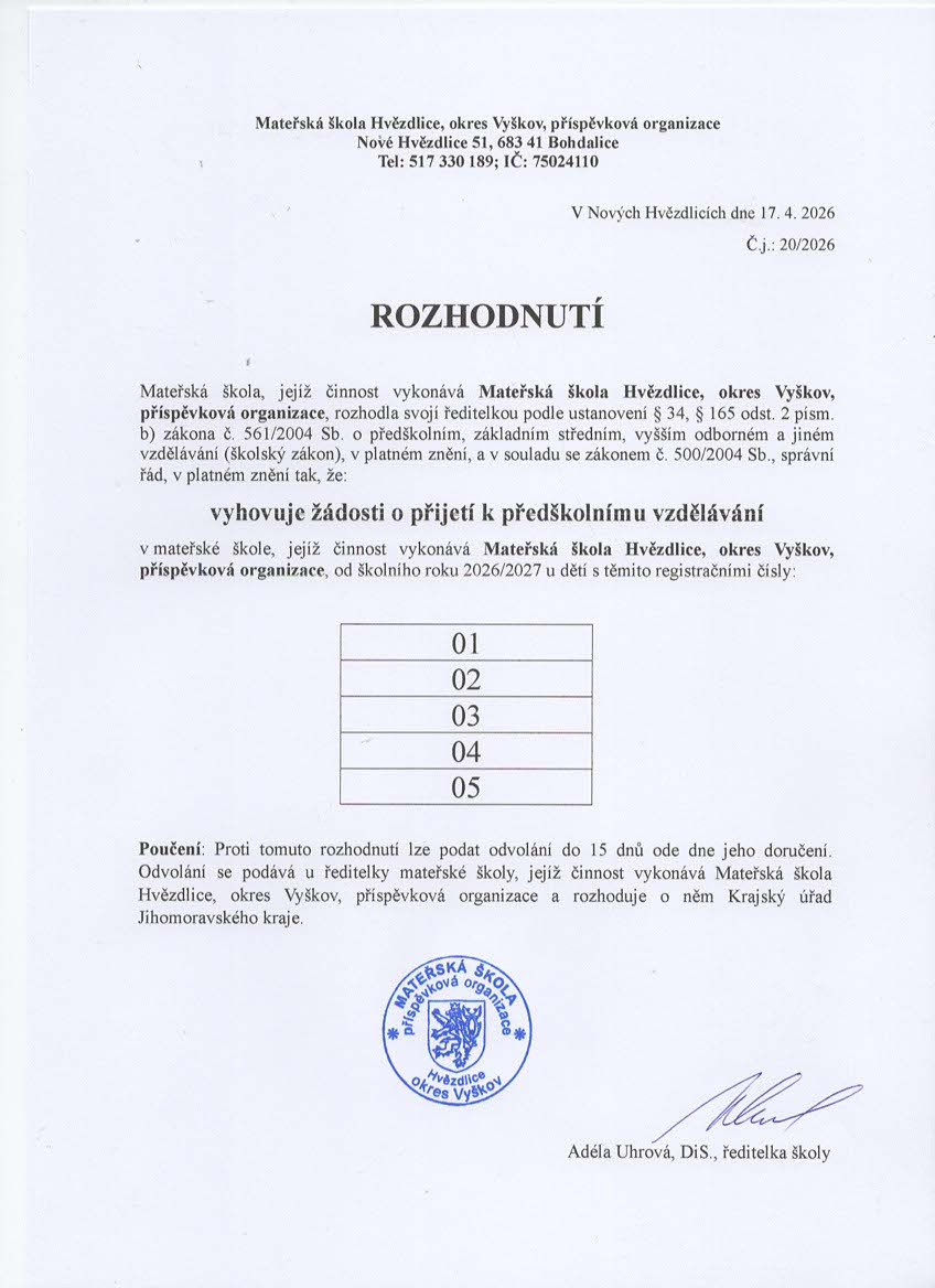 HROMADNÉ ROZHODNUTÍ O PŘIJETÍ K PŘEDŠKOLNÍMU VZDĚLÁVÁNÍ 2026